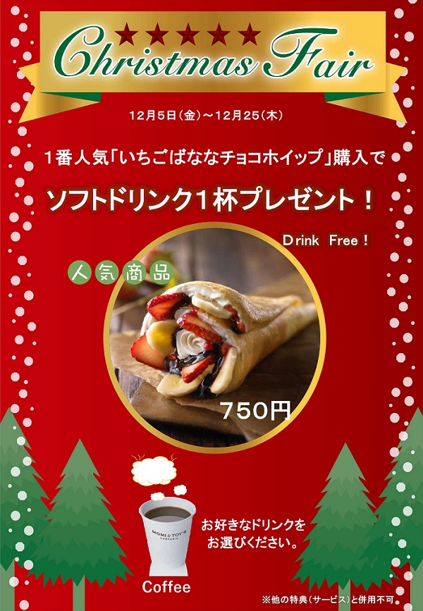 1番人気の「いちごばななチョコホイップ」購入のお客様に、お好きなソフトドリンクを1杯プレゼント!