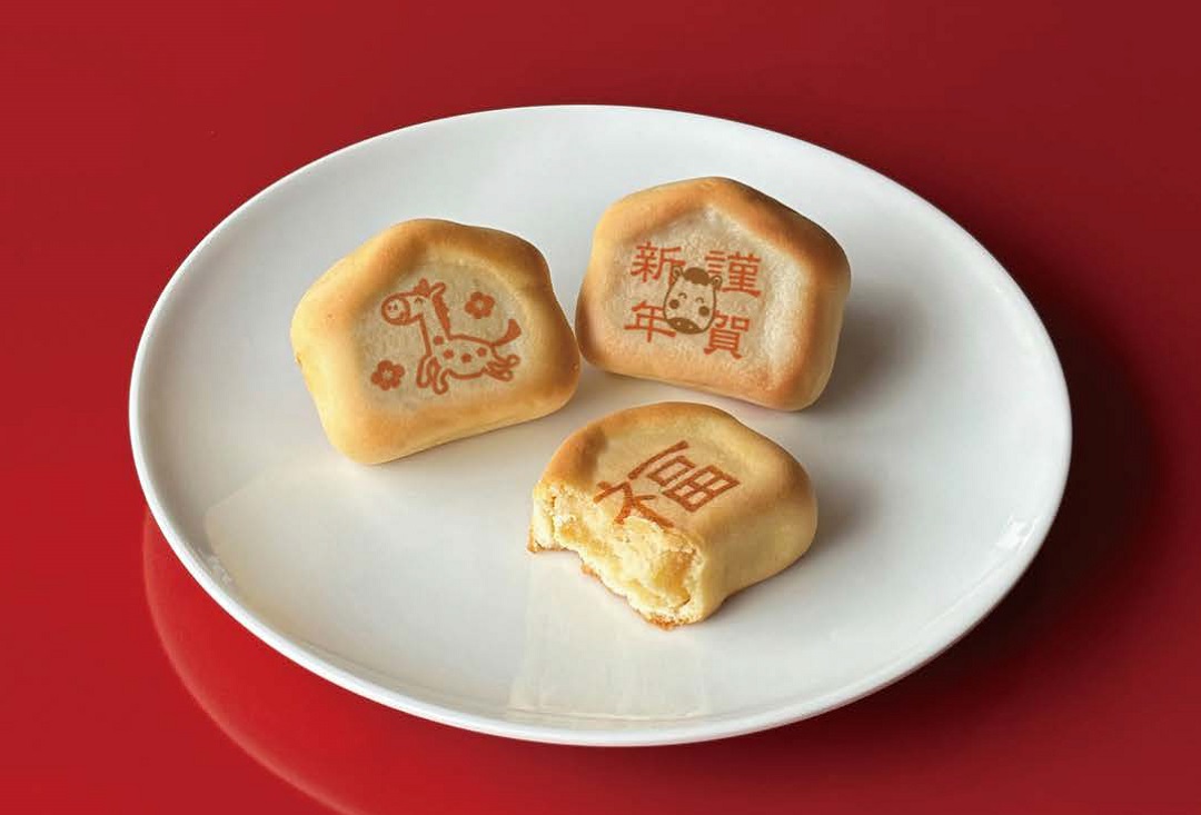 優しい味はそのままに、幸せを呼ぶメッセージや柄の描かれた、絵馬の形をしたお正月限定の母恵夢です。