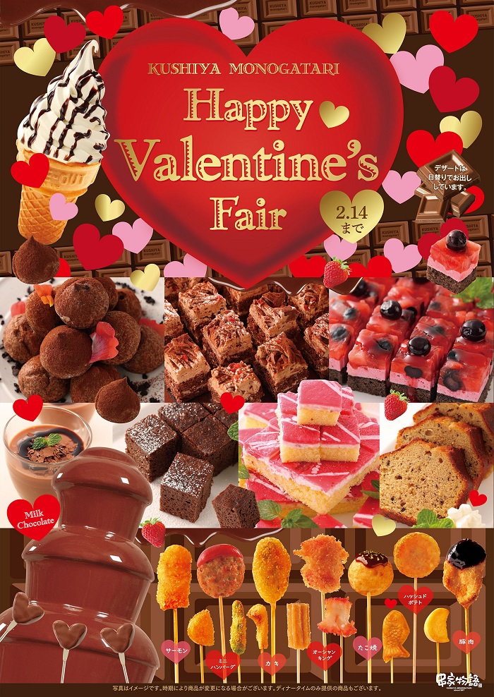提供期間:2026年1月15日(木)~2月14日(土)期間限定のスイーツなどが楽しめるバレンタインフェアを今年も開催いたします。いちご狩りフェアとバレンタインをコラボした特別な期間で、いちごのスイーツとチョコレートを楽しめるのは今だけ!ぜひ串家物語でバレンタインをお楽しみください。皆様のお越しをお待ちしております! 店舗情報はこちら 前のページ 一覧