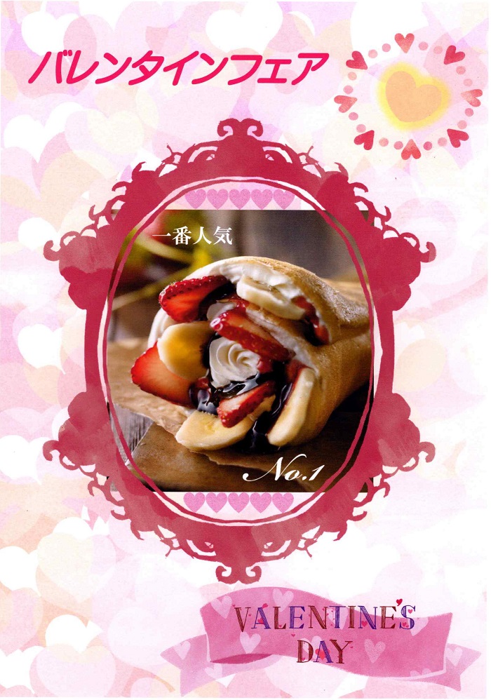 只今、バレンタインフェア開催しております。1番人気の「いちごばななチョコホイップ」に、今だけかわいいハートのクッキーつき!この機会に、是非 ”とろけるクレープ” をご賞味くださいませ。 店舗情報はこちら 前のページ 一覧